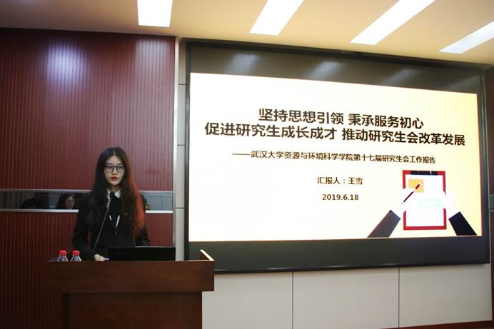 第十七届研究生会主席王雪作《坚持思想引领,秉承服务初心,促进研究生成长成才,推动研究生会改革发展》工作报告,对思想引领、组织建设、学术创新、文化活动、宣传工作、生活权益、实习实践、心理健康等工作进行了回顾与总结,并对资环研会的今后工作提出了思考与展望;大会筹备委员会提案组组长尹鑫同学作《武汉大学澳门威尼斯人官网