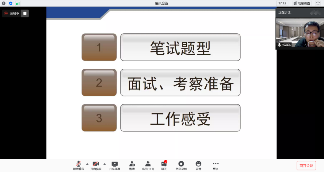 单渌铱从浙江省选调生报考条件、流程、笔试、面试、个人工作内容、选调生备考建议几个方面进行了分享。首先,单渌铱着重介绍了确定人选、任职定级、培养锻炼相关政策:浙江省面试结束后,按照“首轮排名,二轮双选”的方式确定拟选调人选;任职定级上选调生录用后实行为期一年的试用期;选调生接受专门培训后,安排到基层锻炼。关于笔试,单渌铱介绍了2020年浙江省选调生笔试和面试的题型。最后,单渌铱强调笔试一定要多刷题,面试可根据自己情况酌情报班并且加强练习,同时要注意多关心时事政治,品读习近平语录,提升思想觉悟,答题时与时事联系在一起。