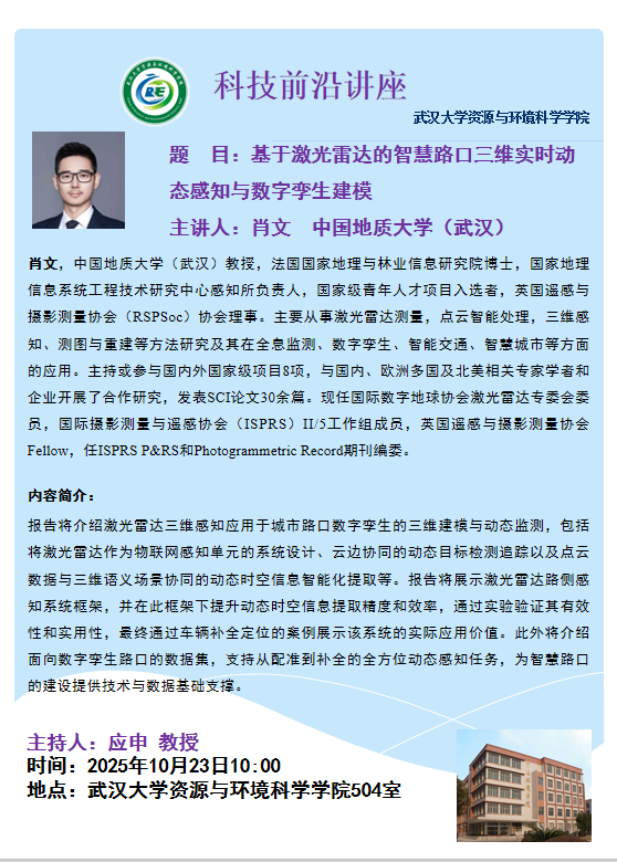【学术讲座】10月23日上午 中国地质大学(武汉)肖文教授 基于激光雷达的智慧路口三维实时动态感知与数字孪生建模