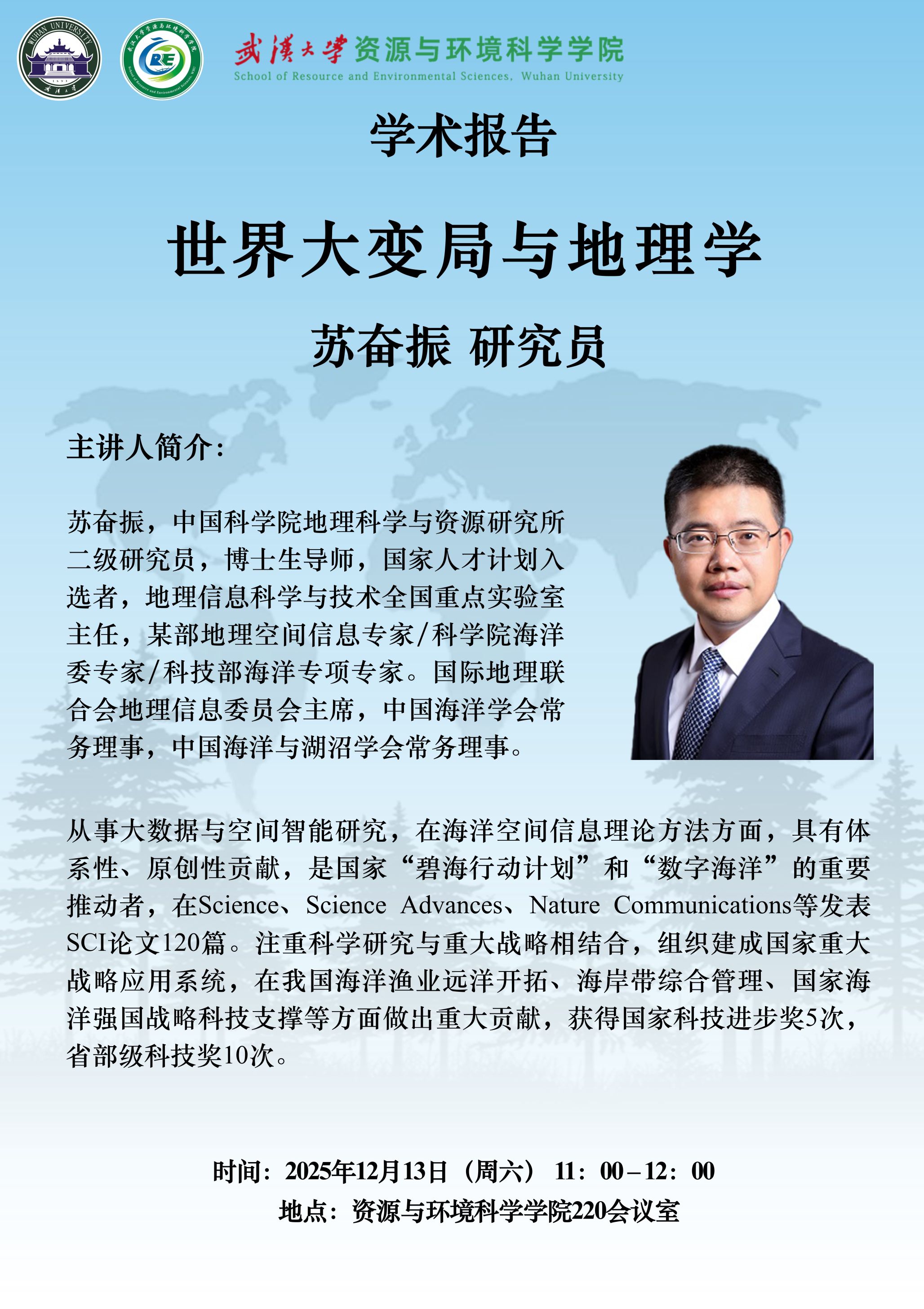 【学术报告】12月13日上午11:00-12:00 中科院地理所 苏奋振研究员 世界大变局与地理学