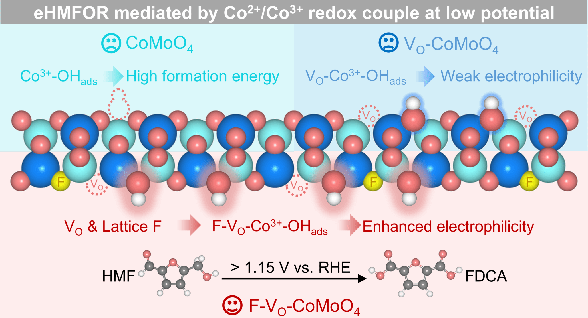 针对上述挑战,研究团队设计了一种兼具氧空位(VO)与晶格氟(F)掺杂的F-VO-CoMoO4催化剂。该材料通过VO促进低电位*OH的生成,并借助F原子的强电负性增强关键中间体的亲电性,协同激活了Co2+/Co3+电对在低电位下的eHMFOR活性。在仅1.15 V的低电位下即可驱动HMF转化为高附加值化学品FDCA,其产率高达95.3%,法拉第效率达96.1%。这一成果突破了传统钴基催化剂的性能瓶颈,为设计高效的生物质电氧化催化剂提供了理论依据。