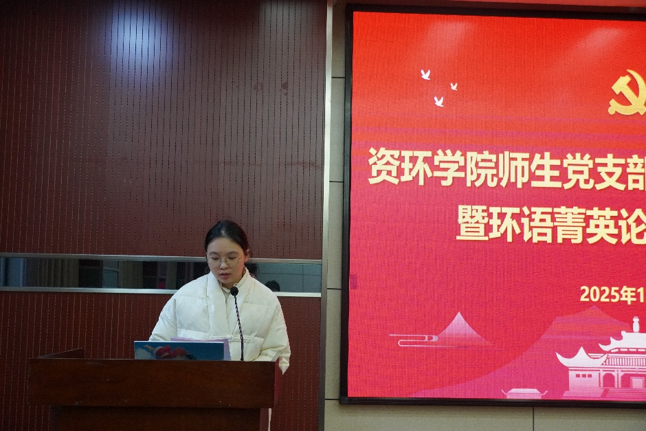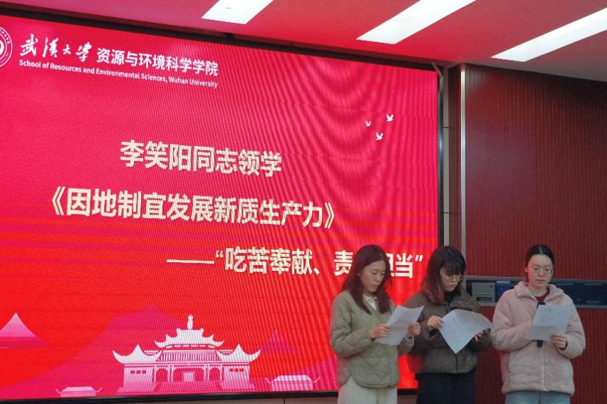 紧接着,环境科学与工程系研究生第一党支部书记李笑阳及支委代表围绕《因地制宜发展新质生产力》重要论述进行了专题领学。她们聚焦其中蕴含的“吃苦奉献、责任担当”精神,结合研究生科研实际展开阐述,强调发展新质生产力是一场必须久久为功的攻坚之战,呼唤科研人员摒弃骄娇二气、勇于挑战“硬骨头”,坚持以科技为民的奉献导向,自觉将个人研究融入国家发展大局。在此基础上,领学进一步引导与会党员思考如何在科研实际中锤炼吃苦本领、在学术报国中践行奉献精神、在服务社会中强化责任担当,并号召大家将个人奋斗与国家需要紧密结合,以实际行动投身于发展新质生产力的时代浪潮。