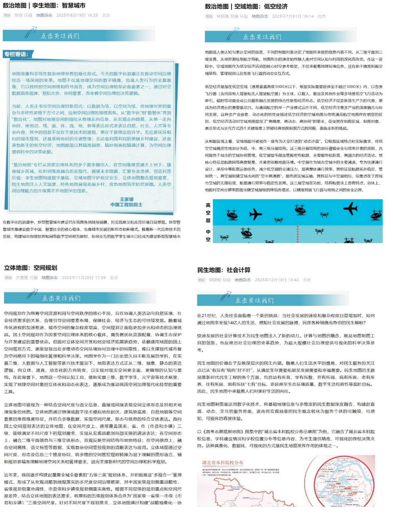 科普作品创作呈现多元化态势。9月推出首部原创科普视频《碳踪者》,以动画演示结合实验讲解的形式,生动解读碳足迹监测与自然资源保护知识,并获评2025年测绘地理信息科普作品(微视频类);持续负责建设《地图》杂志“数治地图”专栏,发布“孪生地图:智慧城市”“空域地图:低空经济”“立体地图:空间规划”等多篇汇聚专业灵感的科普文章。