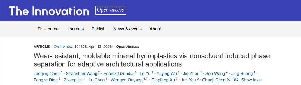 相关论文以“Wear-resistant, moldable mineral hydroplastics via nonsolvent induced phase separation for adaptive architectural applications”为题,发表在The Innovation上。本文第一作者为课题组2022级博士研究生陈俊青,通讯作者为陈朝吉教授,通讯单位为武汉大学。课题组网站://biomass.amwnsrgw.com/index.htm